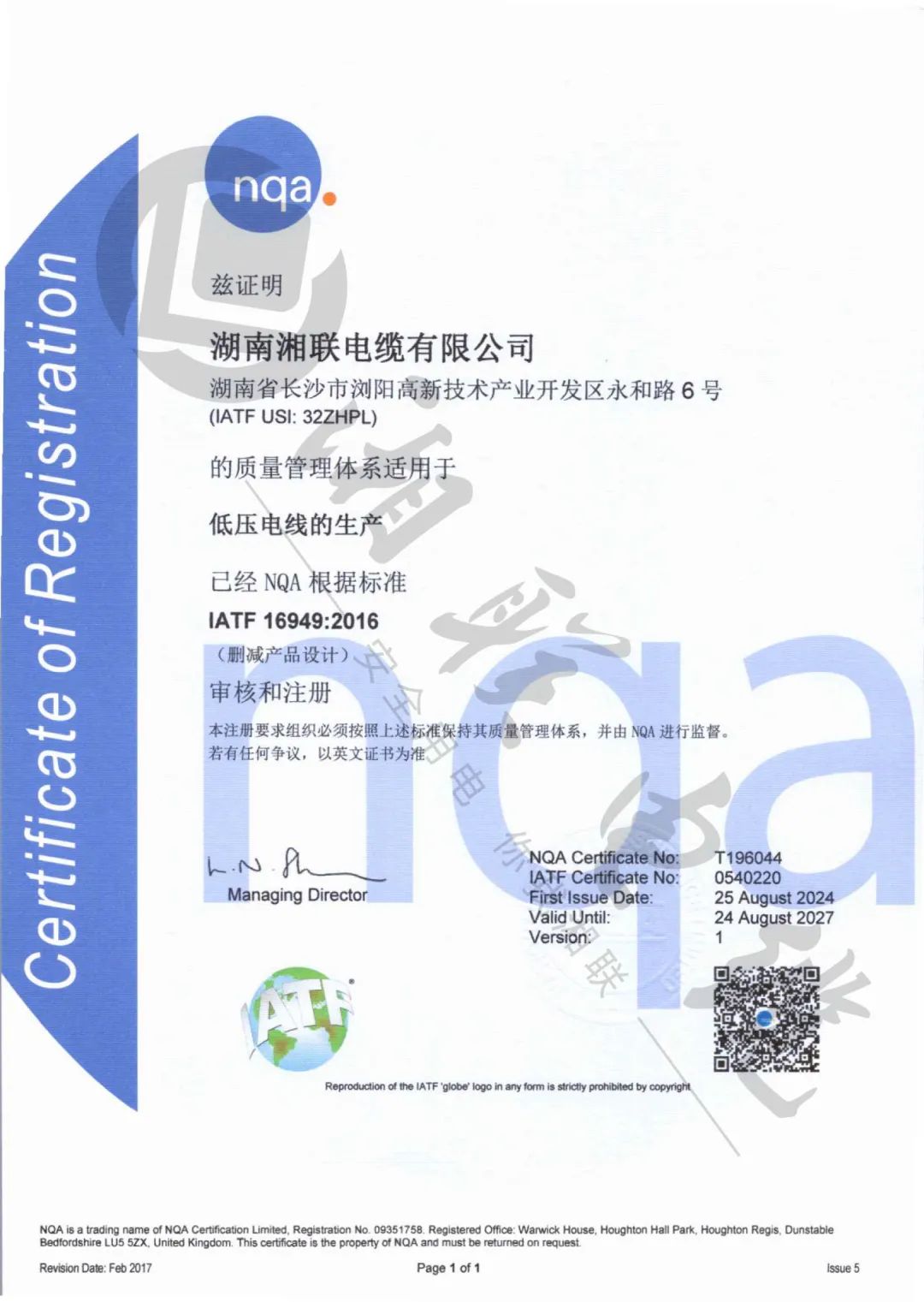 湘聯(lián)電纜通過IATF16949質量管理體系認證!
