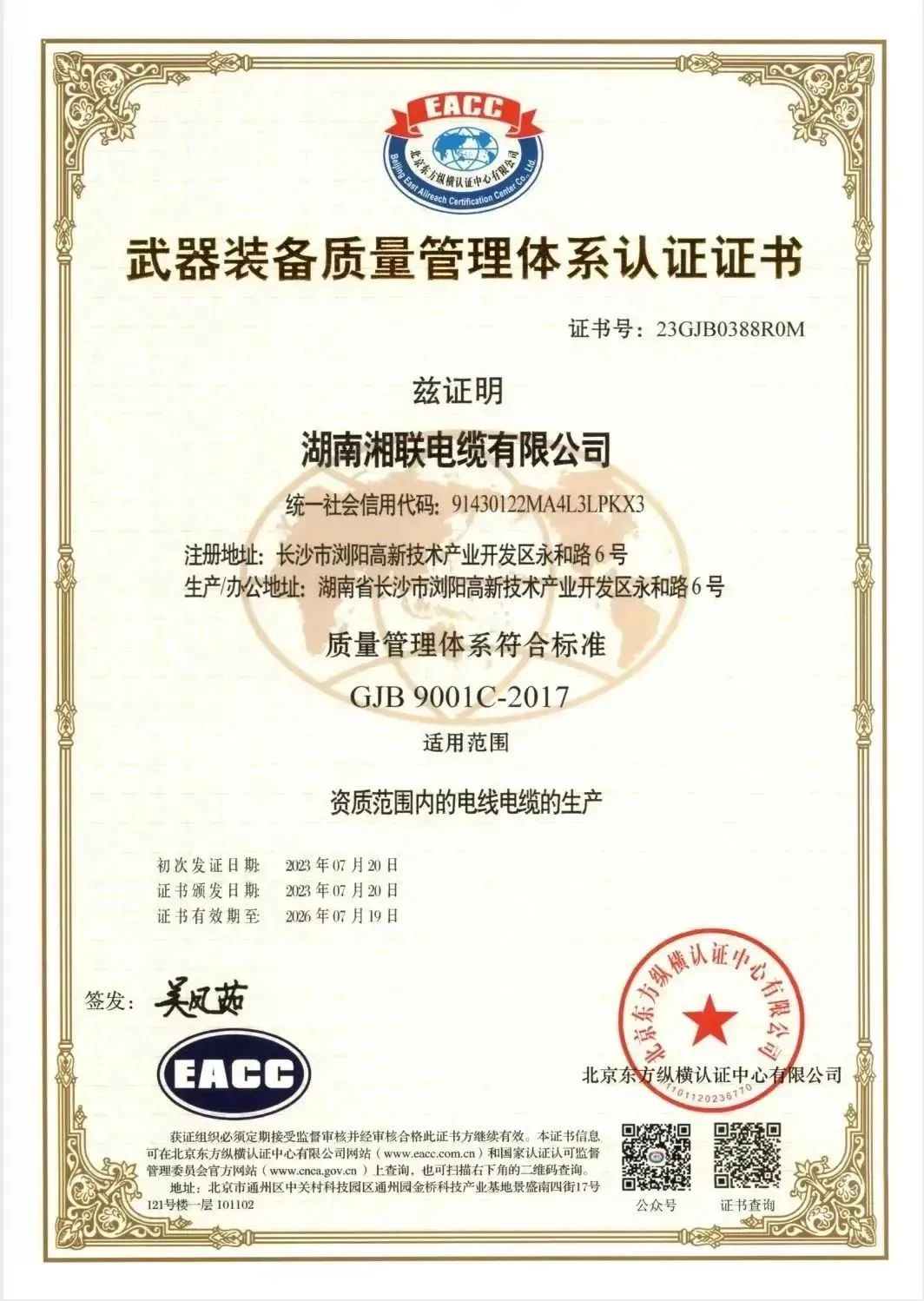 7月20日,湖南湘聯(lián)電纜有限公司順利通過國軍標質(zhì)量管理體系認證,獲得《武器裝備質(zhì)量管理體系認證證書》,質(zhì)量管理體系符合:GJB9001C-2017標準。
