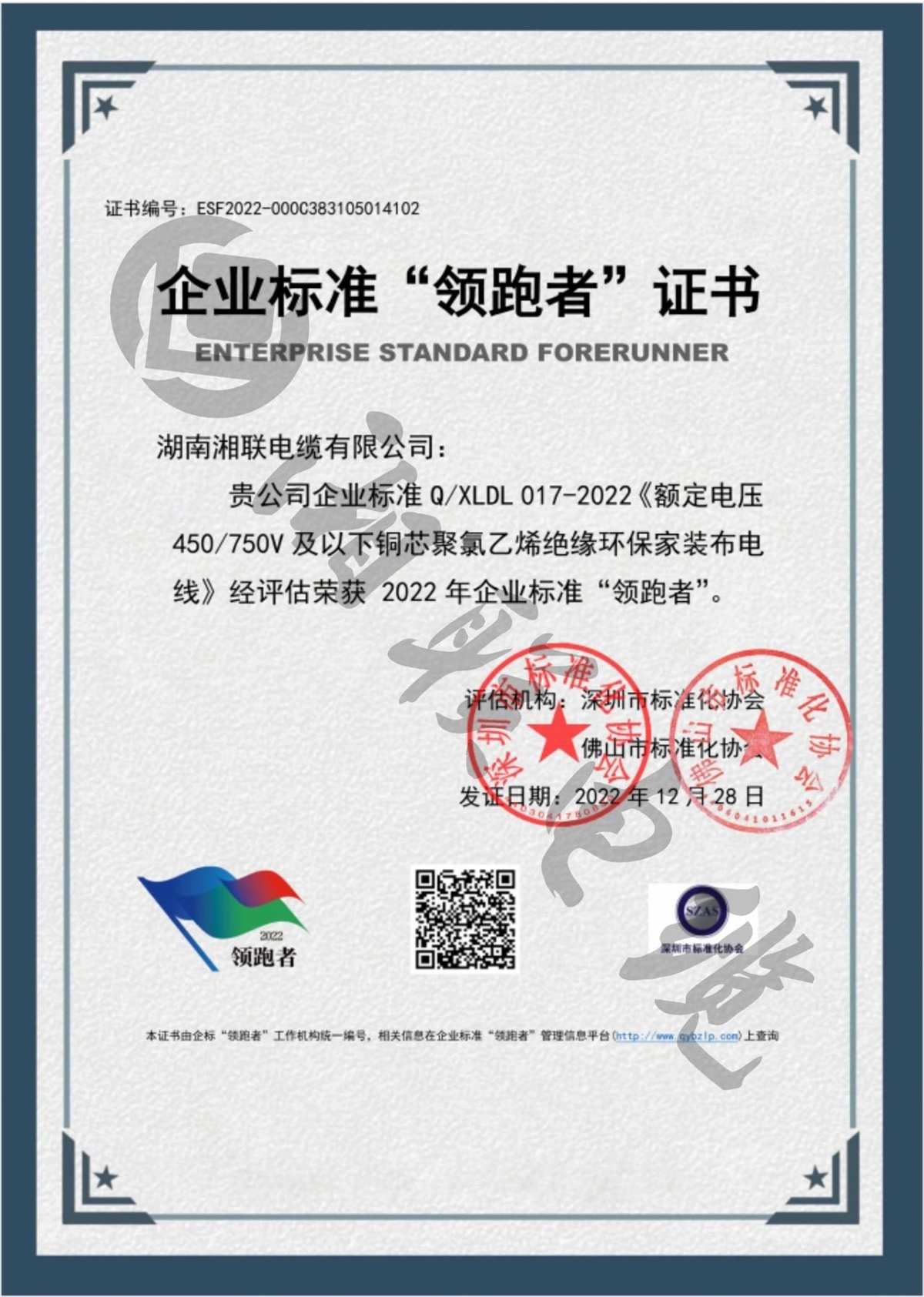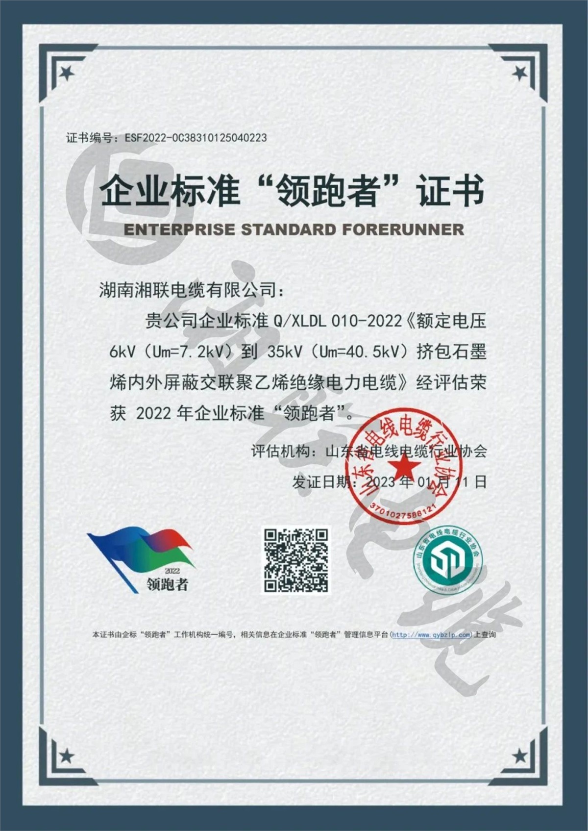 1月,湖南湘聯(lián)電纜有限公司三項(xiàng)企業(yè)標(biāo)準(zhǔn)經(jīng)評(píng)定,榮獲2022年全國企業(yè)標(biāo)準(zhǔn)“領(lǐng)跑者”。
