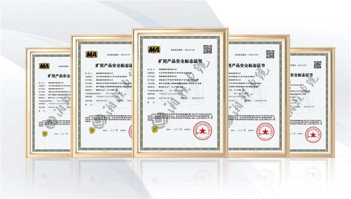 礦用電纜必須嚴格遵守國家及行業(yè)雙重標準,需按照GB/T 12972《礦用橡套軟電纜》、MT818-2009《煤礦用阻燃電纜》生產(chǎn),都應經(jīng)過安標國家礦用產(chǎn)品安全標志中心頒發(fā)礦用產(chǎn)品安全標志證書,才能向市場出售 。近期,湘聯(lián)電纜的MVV-0.6/1(1.5~300)mm2煤礦用聚氯乙烯絕緣聚氯乙烯護套電力電纜、MYJV-8.7/10(25~300)mm2煤礦用交聯(lián)聚乙烯絕緣聚氯乙烯護套等6款電力電纜成功取得礦用產(chǎn)品安全標志證書,其產(chǎn)品在阻燃、耐壓、抗拉強度等方面均達到行業(yè)標準。